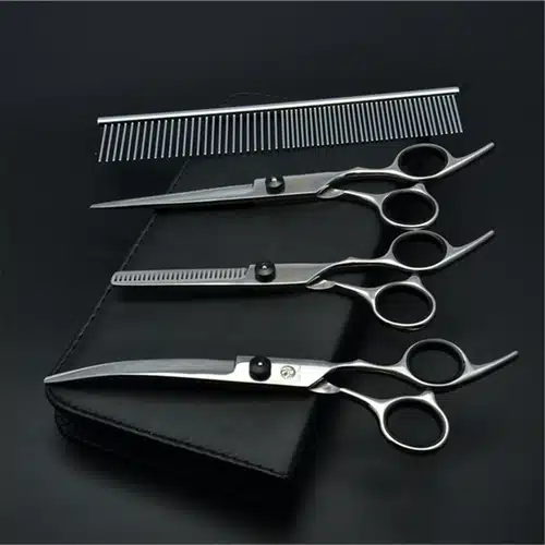 El set incluye tijeras de entresacar de 6 pulgadas y tijeras rectas y curvas de 7 pulgadas, ideales para cualquier tipo de corte. Además, ¡puedes personalizar las tijeras con tu propio logo o pedirlas sin marca! Un producto exclusivo para profesionales que buscan destacar.