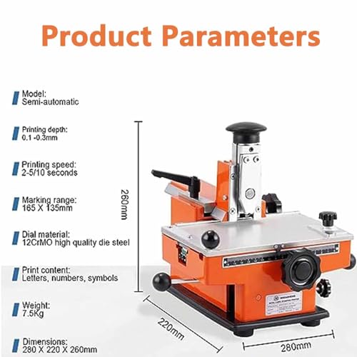 Su sistema de varilla de presión ajustable permite controlar fácilmente el espaciado entre caracteres, logrando grabados limpios, uniformes y de alta velocidad (2–5 s por impresión) con una profundidad de 0.1–0.3 mm.