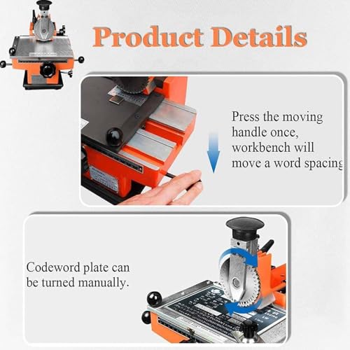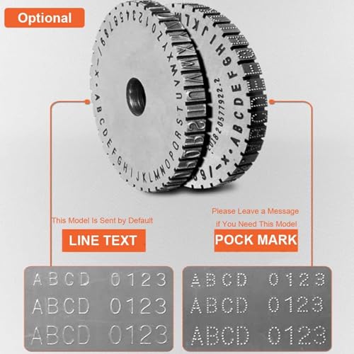 La rueda de grabado incluye letras mayúsculas, números y símbolos comunes, sin necesidad de moldes adicionales. Perfecta para marcar modelos, fechas, lotes, números de serie o nombres personalizados.
