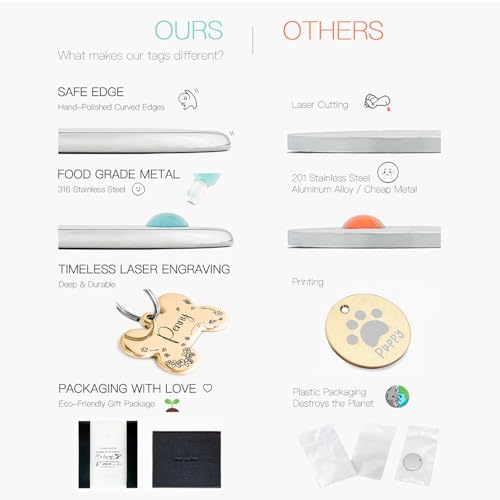 Fabricadas en acero inoxidable de alta calidad, son resistentes al agua, al uso diario y al paso del tiempo. Puedes grabar el nombre de tu mascota en la parte frontal y añadir teléfono u otra información importante en la parte trasera, para mayor tranquilidad.